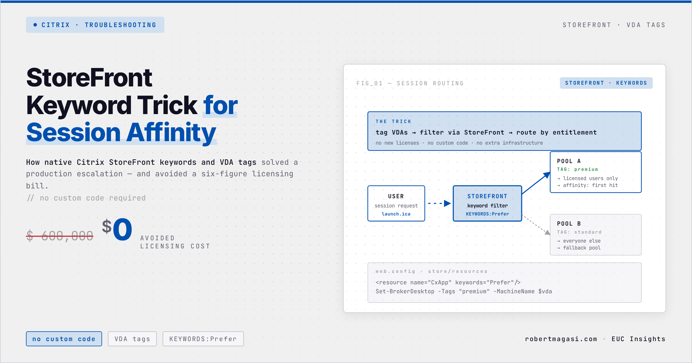 How native Citrix StoreFront keywords and VDA tags solved a production escalation - and avoided a six-figure licensing bill. No custom code required.